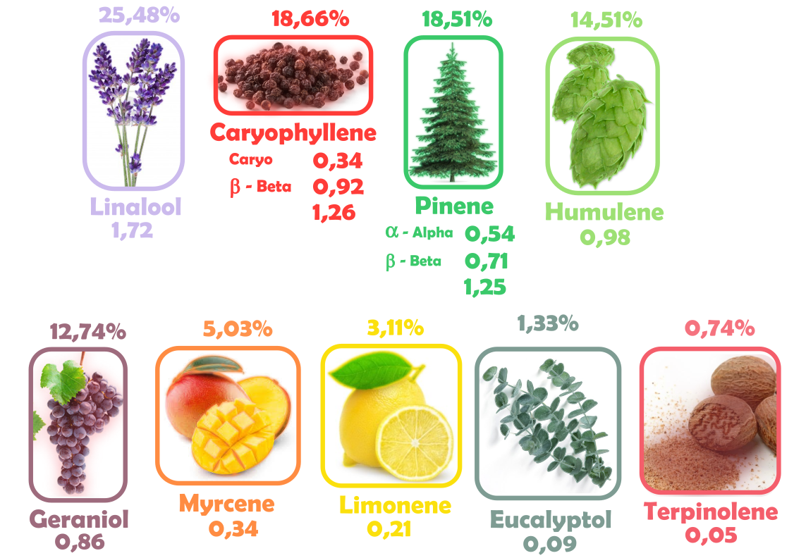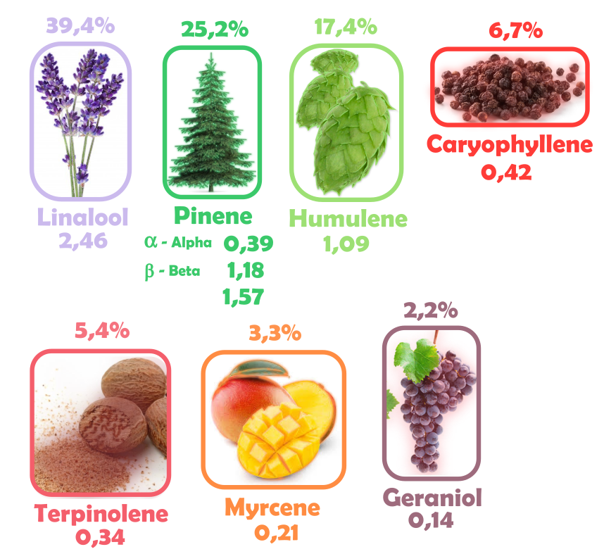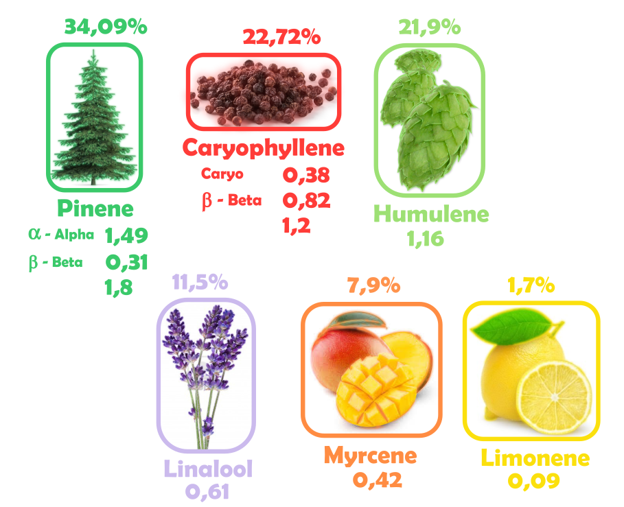 Total amount of terpenes measured: 12,34 mg/g (1,234%)